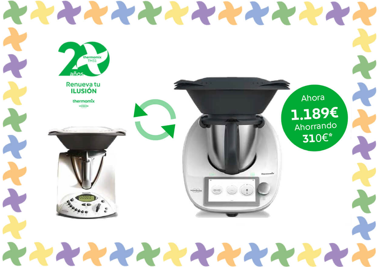 Nuestro TM31 ya no podrá repararse a partir del 1 de enero de 2025 y tampoco estarán disponibles a la venta sus recambios, por eso queremos premiar tu fidelidad ofreciéndote la oportunidad de cambiar tu TM31 por un Thermomix® TM6 por 1.189€.
