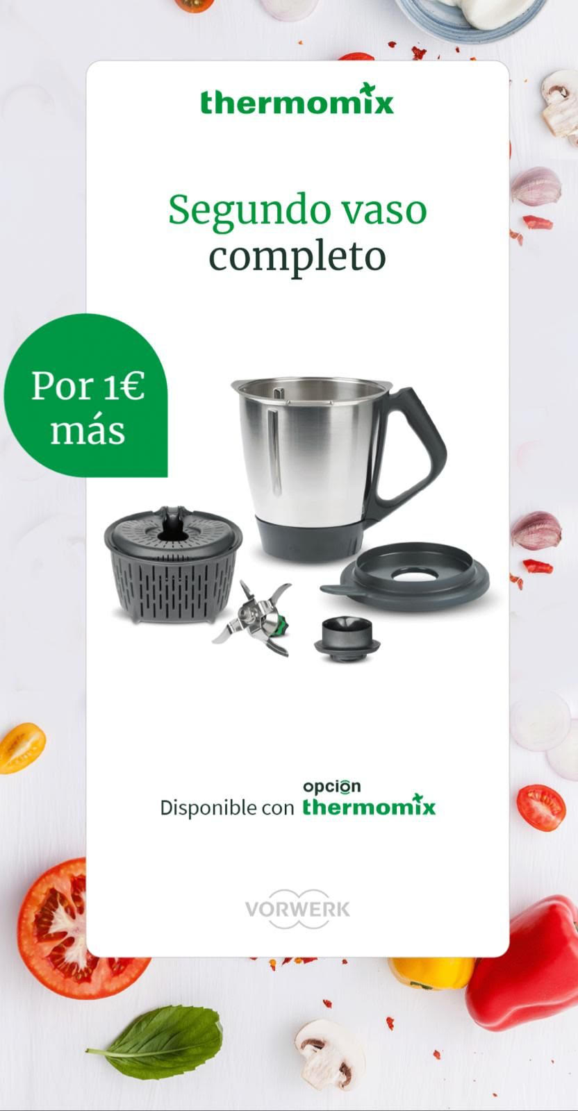 Sí, tal y como lo estás leyendo, ahora puedes tener tu Thermomix con un Segundo Vaso Completo por 1€ más. Y para qué quiero un segundo vaso os preguntareis , pues un segundo vaso para no perder ni un segundo en la cocina, para familias numerosas, para personas con problemas de celiaquía, para evitar cruces no deseados, etc... y porque siempre se ha dicho que dos mejor que uno. Estás a un solo clic de disfrutar del verano de una forma diferente. Solicita tu demo y lo compruebas.