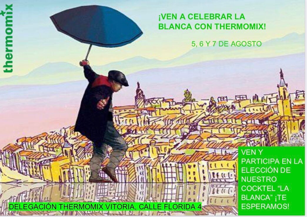 ya se empiezan a oir los primeros sones que dan lugar al inicio de las fiestas de Vitoria en honor a su patrona la Virgen Blanca, por eso te invito a que te des una vuelta por la delegación de Florida 4 para que elijas tu cocktail favorito entre las opciones que ofrecemos. El cocktail elegido por la mayoría será enviado al departamento I+D desarrollo de recetas para que pueda ser publicado tanto en una colección de la plataforma Cookidoo como en la revista mensual. Queremos que Vitoria tenga presencia tal y como se merece en este maravilloso mundo de Thermomix. Te espero el jueves 5 en horario de 18:00 a 20:00 y el viernes 6 de 12:00 a 14:00.