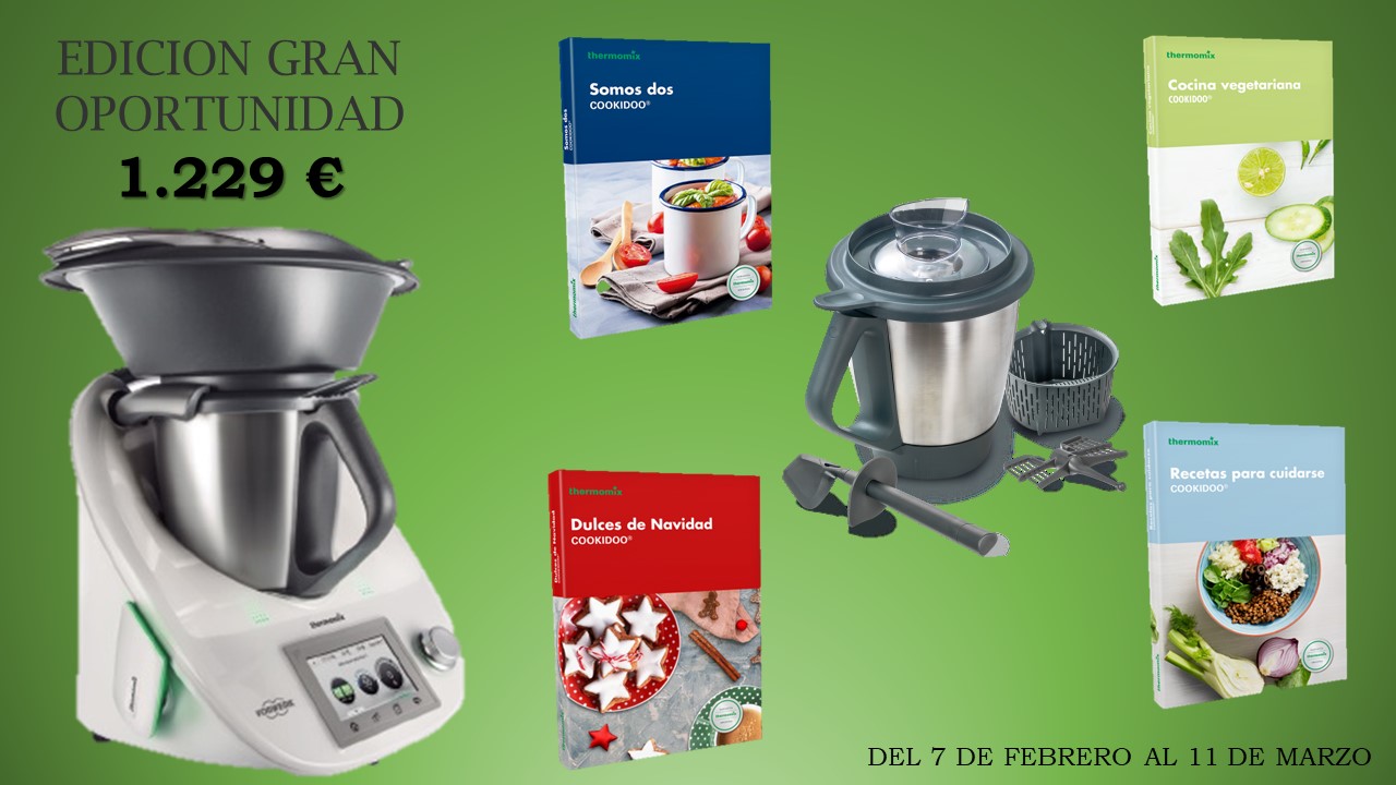 Thermomix + segundo vaso + 4 libros tamaño bolsillo donde se incluyen diferentes e interesantes recetas que no te puedes perder.