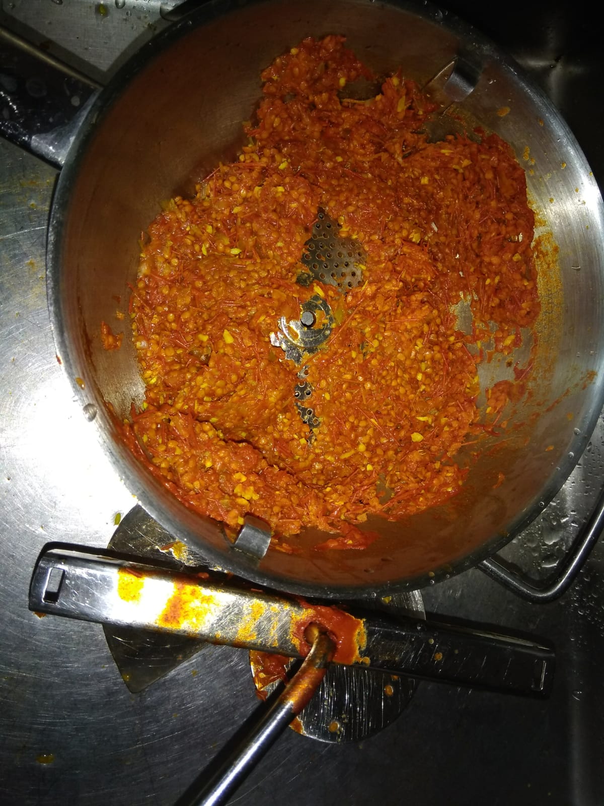 Añadir al sofrito el tomate triturado.la sal y la cúrcuma (cuidado no sobrepasar el máximo de capacidad, yo lo lleno hasta el limite )