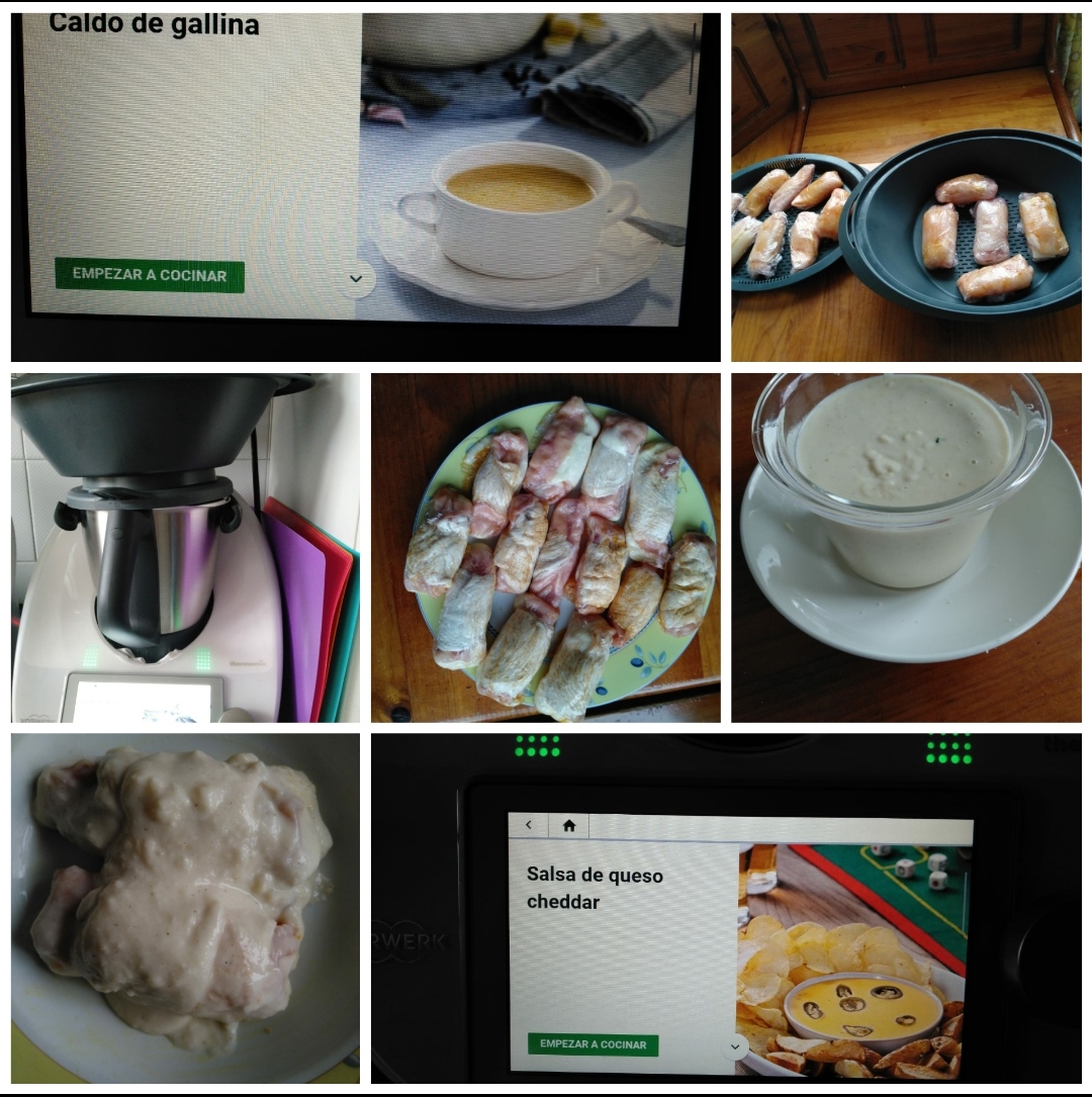 Durante la receta de CALDO DE GALLINA en el paso 3 donde hay que ponerlo a 20 minutos velocidad 2 temperatura varoma añadimos las pechugas de pollo que previamente hemos preparado con jamón y queso en el varoma. Cuando terminen los 20 minutos se retira el recipiente varoma con las pechugas de pollo y programamos 40 minutos, 100 grados velocidad 2 sustituyendo el recipiente varoma por el cubilete y finalizamos la receta de caldo de pollo. Para finalizar hacemos una salsa de queso cheddar para acompañar los rollos.